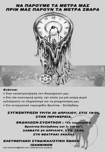 Την Τρίτη 20/04 καλούμε συγκέντρωση ενάντια στο νομοσχέδιο Βρούτση - Χατζηδάκη, την προσπάθεια κράτους και κεφαλαίου ακόμη μεγαλύτερης καταστρατήγησης των δικαιωμάτων και φτωχοποίησής μας, στις 18:00, στην Περιφέρεια Ηπείρου.