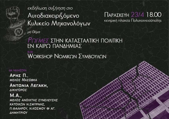 Την Παρασκευή 23/4 στο Αυτοδιαχειριζόμενο Κυλικείο Μηχανολόγων σχετικά με το πως ο κόσμος των γειτονιών πλημμύρισε τους δρόμους απαιτώντας να μπει ένα τέλος στους τραμπουκισμούς των ένστολων συμμοριών, στα πρόστιμα και στις (άσχετες με την υγειονομική προστασία) απαγορεύσεις.