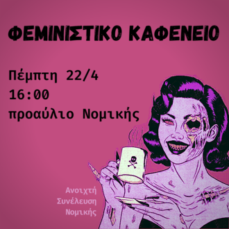 Έτσι, καλούμε την Πέμπτη 22/4/2021 σε ένα φεμινιστικό καφενείο στο προαύλιο της Νομικής. Φέρτε τα ποτά σας, θα παίζει υπέροχο playlist, θα έχουμε vegan γλυκάκια για κέρασμα.