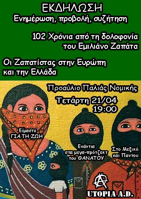 ΕΚΔΗΛΩΣΗ για το ταξίδι των Ζαπατίστας στην Ευρώπη και την Ελλάδα, ενημέρωση, προβολή και συζήτηση. 102 χρόνια απο τη δολοφονία του Εμιλιάνο Ζαπάτα, η φλόγα της επανάστασης παραμένει ζωντανή. Είμαστε ΓΙΑ ΤΗ ΖΩΗ, Ενάντια στα μεγα-πρότζεκτ του ΘΑΝΑΤΟΥ στο Μεξικό και παντού.