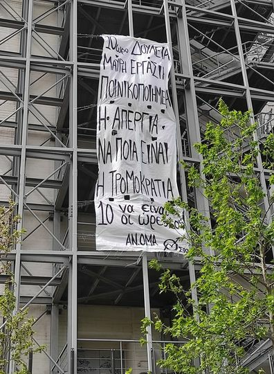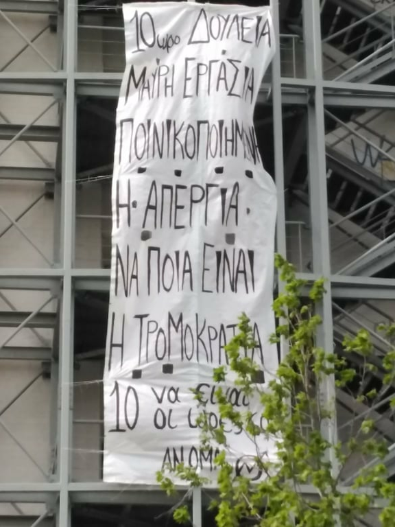 Πανό που αναρτήσαμε στην εξωτερική σκάλα του βιολογικού για τον εργασιακό μεσαίωνα και το νομοσχέδιο που καταργεί και επίσημα το 8ωρο.