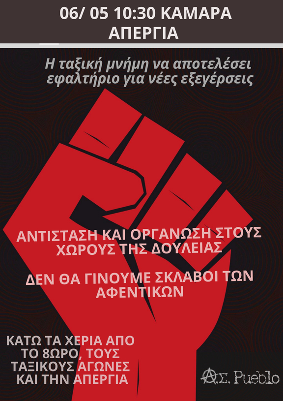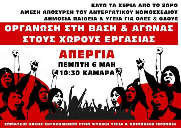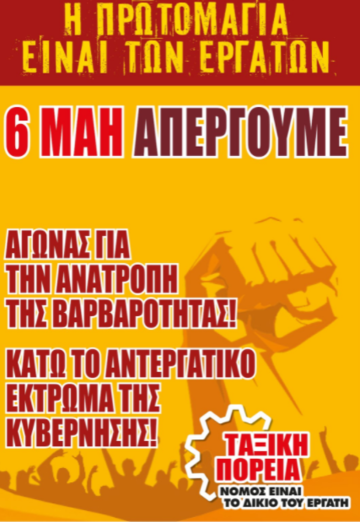ΝΑ ΟΡΓΑΝΩΣΟΥΜΕ ΤΗΝ ΑΠΕΡΓΙΑ ΣΤΙΣ 6 ΜΑΗ, με μαζικές απεργιακές διαδηλώσεις σε όλη τη χώρα. Να ζωντανέψουμε τα σωματεία μας και τις διαδικασίες τους και να πάρουμε αποφάσεις αγώνα. Για να μην περάσει το αντεργατικό έκτρωμα. Για 5νθήμερο-8ώρο, υπερωρίες, κυριακάτικη αργία, ενάντια στον εργασιακό μεσαίωνα. Για συλλογικές συμβάσεις με αυξήσεις στους μισθούς και εργασιακά δικαιώματα. Για επίδομα ανεργίας σε όλους τους ανέργους χωρίς προϋποθέσεις, για πλήρη ασφάλιση-περίθαλψη και μέτρα προστασίας. Για ελεύθερο, ανεξάρτητο συνδικαλισμό χωρίς κρατικό έλεγχο. Για το δικαίωμα των λαών στην Ειρήνη, ενάντια στον πολεμικό κίνδυνο.