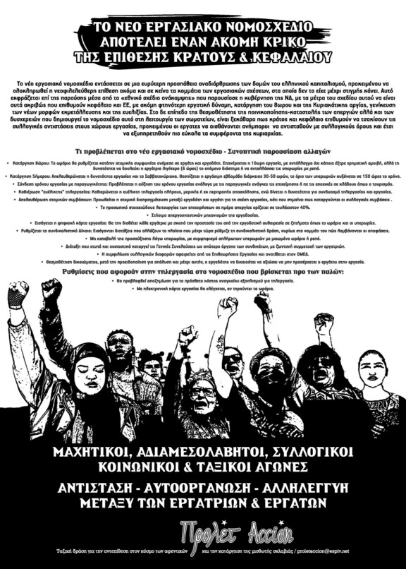 Και όλα αυτά συντελούνται σε ένα περιβάλλον τεράστιας ανεργίας και μαύρης εργασίας, εντατικοποίησης της εκμετάλλευσης, τρομοκρατίας και απολύσεων, με τους εργάτες να εκβιάζονται καθημερινά για την επιβίωση. Το νέο νομοσχέδιο που συνοδεύεται από τη ρητορική της «υπεράσπισης» της εργασίας και του εκσυγχρονισμού της αγοράς της, στην πραγματικότητα νομιμοποιεί την ελαστικότητα και την εξατομικευμένη επιβίωση, αφαιρώντας ακόμη περισσότερο από τις εργάτριες τα όποια θεσμικά μέσα έχουν, για να αντιπαρατεθούν στα αφεντικά. Ακόμη και για τη λεγόμενη μαύρη εργασία καθίσταται συνυπεύθυνος και μάλιστα διώκεται και ο εργάτης, σε μια χυδαία αντιστροφή των ρόλων στην καπιταλιστική πραγματικότητα. Η εκβιαζόμενη, το εκμεταλλευόμενο άτομο, καθίστανται υπεύθυνα για την πιο βάρβαρη μορφή του εκβιασμού που τους ασκείται. Με χρόνια κατακρεουργημένη τη διαιτησία και με τις παρούσες διατάξεις που αλαφρώνουν τα χέρια των αφεντικών από οποιαδήποτε στοιχειώδη υποχρέωση ενημέρωσης και ειδοποίησης των εργατών σε περίπτωση απόλυσης, με τις επιθεωρήσεις εργασίας να αποτελούν τραγέλαφο, αυτό που εξυφαίνεται είναι μια κατάσταση εργατικού μεσαίωνα.