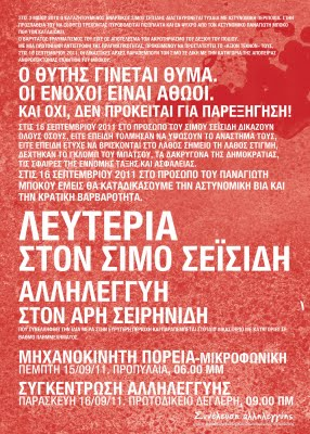 Οι διωκτικοί μηχανισμοί, η δικαστική χούντα, τα ΜΜΕ είναι οι στυλοβάτες μιας εξουσίας που έχει εξαπολύσει ολομέτωπη επίθεση στην κοινωνία και συγχρόνως τρέμουν μπροστά στον κίνδυνο γενικευμένων κοινωνικών εκρήξεων. Κάθε κίνηση που κάνουν μόνο τυχαία δεν είναι, εντάσσεται σε ένα σχέδιο που στόχο έχει να παραδειγματίσει να εκφοβίσει όποιον αντιστέκεται στην κρατική βαρβαρότητα. Μέσα σε αυτό το πλαίσιο εντάσσεται και η δίωξη του Σίμου Σεϊσίδη.