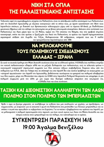Κάτω το κράτος-τρομοκράτης του Ισραήλ - Νίκη στον Παλαιστινιακό λαό! Συγκεντρώσεις 14 & 15/5