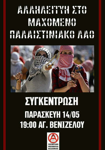 Ήρθε η ώρα να βγούμε μπροστά, να αναλάβουμε τις ευθύνες που μας αναλογούν ως εργάτες, ως προλετάριοι, ως κομμουνιστές, ως αναρχικοί: για να ακουστεί η φωνή της Παλαιστίνης στα μετόπισθεν των δυτικών μητροπόλεων και να σπάσει η σιωπή που προωθούν οι κυβερνήσεις της Ευρώπης. Για να παύσει η βαρβαρότητα του κράτους του Ισραήλ, για να μπλοκαριστεί η πολεμική προετοιμασία στην περιοχή, για έναν κοινό αγώνα των λαών της Μέσης Ανατολής και του κόσμου ενάντια στον ιμπεριαλισμό και τον πόλεμο, τον καπιταλισμό και το κράτος.