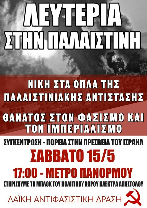 Το Σάββατο 15 Μαΐου στις 5μ.μ. καλούμε την εργατική τάξη και το λαό, την αγωνιζόμενη νεολαία κάθε προοδευτικό και δημοκρατικό άνθρωπο στο μετρό στάση Πανόρμου για να κατευθυνθούμε στην ισραηλινή πρεσβεία, να διαδηλώσουμε μαζικά, οργανωμένα και μαχητικά, απαιτώντας με τις μικρές μας δυνάμεις, από το δικό μας μετερίζι να σταματήσει η γενοκτονία τουπαλαιστινιακούλαού.