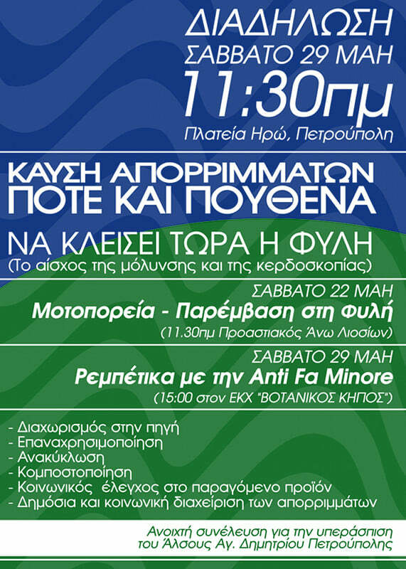 Mια βδομάδα πριν, το Σάββατο 22 Μάη, θα προηγηθεί μοτοπορεία προς τις εγκαταστάσεις και το ΧΥΤΑ Φυλής. Το ραντεβού είναι στις 11.30 πμ στον προαστικό των Άνω Λιοσίων.