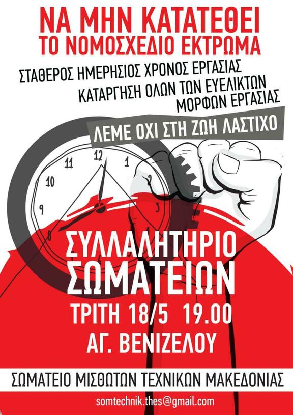 Είναι ώρα ευθύνης για όλους μας συνεπώς να επιλέξουμε το δρόμο του αγώνα! Να οργανωθούμε στα σωματεία μας, να δώσουμε ζωντάνια στη δράση τους με τη συμμετοχή μας! Να διαφυλάξουμε με νύχια και με δόντια το 8ωρο, να παλέψουμε για σταθερό ημερήσιο χρόνο εργασίας, για μείωση ωραρίου! Προετοιμαζόμαστε για νέα απεργιακή απάντηση εάν και εφόσον η κυβέρνηση τολμήσει και φέρει το νομοσχέδιο προς ψήφιση!