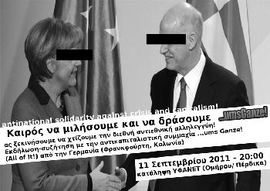 Κράτος και καπιταλιστική παραγωγή αναγκάζουν όλες/ους, να κανονίσουν το μέλλον τους στον ανταγώνισμό μεταξύ τους. Κρίσεις είναι αναπόφευκτες, τα λεγόμενα "Stresstest" δεν θα τις εμποδίσουν. Κοινωνικός σωβινισμός και ο ρατσισμός είναι οι κύριες ιδεολογίες αυτή της crash-κοινωνίας. Απαιτούν προσαρμογή και αποκλεισμό, ανεβάζουν την πίεση σ' όλους/ες και του καθένα στον ίδιο. Αλλά και εκτός της κρίσης ισχύει για μας: δεν θέλουμε κοινωνικότερο, ρεφορμιστικό ή υγιείς καπιταλισμό, αλλά κανέναν! Μιλάμε για μια κριτική, για την οποία δεν υπάρχουν θεσμοί ή κοινοβούλια ή στάνταρ διαδικασίες: η κριτική κοινωνικής εξουσίας στο όλο της. Εμείς λέμε: Ελλάδα, Γερμανία, Ευρώπη... όλα σκατά! Για μια αντιεθνική αλληλεγγύη ενάντια στο σύστημα!