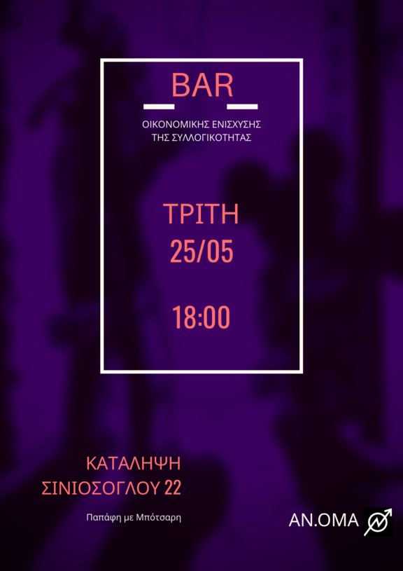 Την Τρίτη 25/5 θα πραγματοποιηθεί μπαρ οικονομικής ενίσχυσης για τα λειτουργικά έξοδα της συλλογικότητας στην κατάληψη Σινιόσογλου 22, στην Κάτω Τούμπα (πάνω από γραφεία ΟΑΣΘ).