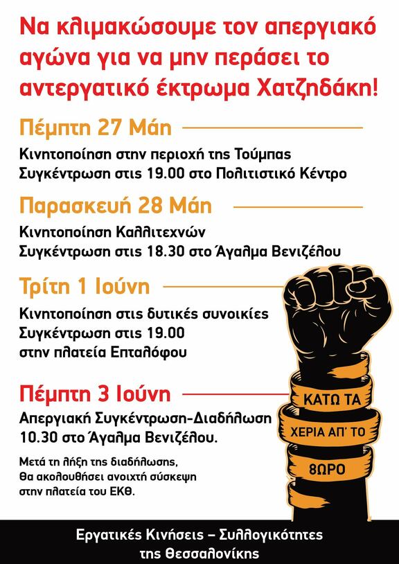 - Την Πέμπτη 3 Ιούνη, προτείνουμε στα πρωτοβάθμια σωματεία, τους φοιτητικούς συλλόγους και εργατικές πρωτοβουλίες/κινήσεις αγώνα, απεργιακή συγκέντρωση 10.30 στο Άγαλμα Βενιζέλου.