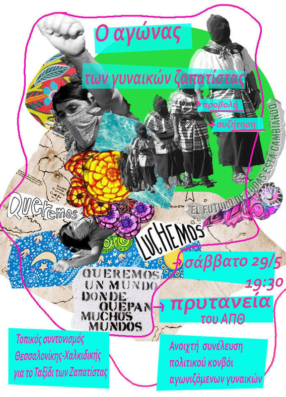Με αφορμή το ταξίδι των ζαπατίστας στην Ευρώπη, που η μεγάλη πλειοψηφία της αντιπροσωπείας τους θα είναι γυναίκες, η «Ανοιχτή Συνέλευση Πολιτικού Κομβόι Αγωνιζόμενων Γυναικών» και ο «Τοπικός Συντονισμός Θεσσαλονίκης - Χαλκιδικής για την υποδοχή των ζαπατίστας» διοργανώνουν το Σάββατο 29 Μαΐου στις 19:30 συζήτηση για τους αγώνες που έδωσαν και δίνουν οι γυναίκες ζαπατίστας για ελευθερία και ισότητα στις κοινότητες. Θα συζητήσουμε την πορεία των αγώνων αυτών, έτσι όπως αποτυπώθηκε αρχικά, πριν ακόμα την εξέγερση του 1994, στον «Επαναστατικό Νόμο των Γυναικών» του 1993, μέχρι και τις σημερινές κατακτήσεις τους.