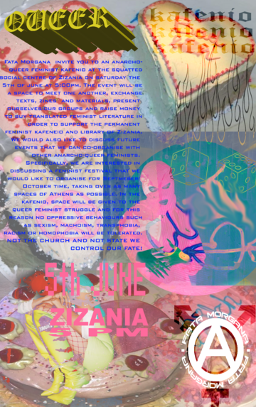 Fata Morgana invite you to an anarcho-queer feminist kafenio at the squatted social centre of Zizania on Saturday the 5th of June at 5:00pm. The event will be a space to meet one another,exchange texts, zines and materials, present ourselves/our groups and raise money to buy translated feminist literature in order to support the permanent feminist kafeneio and library of Zizania. We would also like to discuss future events that we can co-organise with other anarcho-queer feminists. Specifically, we are interested in discussing a feminist festival that we would like to organise for Septmeber/October time, taking over as many spaces of Athens as possible.