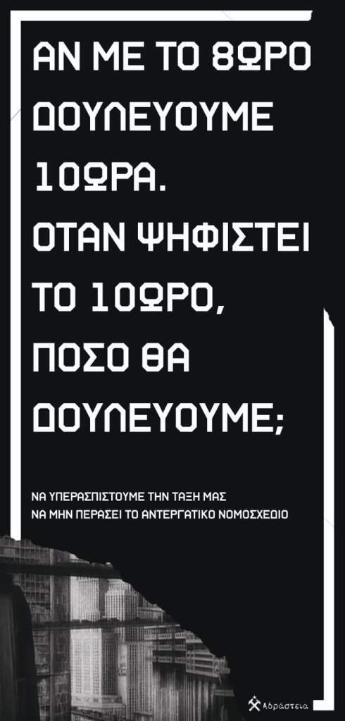 Την Πέμπτη 10/06 καλούμε σε απεργιακή κινητοποίηση ενάντια στο νέο ΑΝΤ(ΕΡΓΑΤΙΚΟ) νομοσχέδιο, που καταργεί το 8ωρο, απελευθερώνει τις ώρες εργασίας σε όσες θέλουν τα αφεντικά και χτυπά συνδικαλιστικά δικαιώματα.