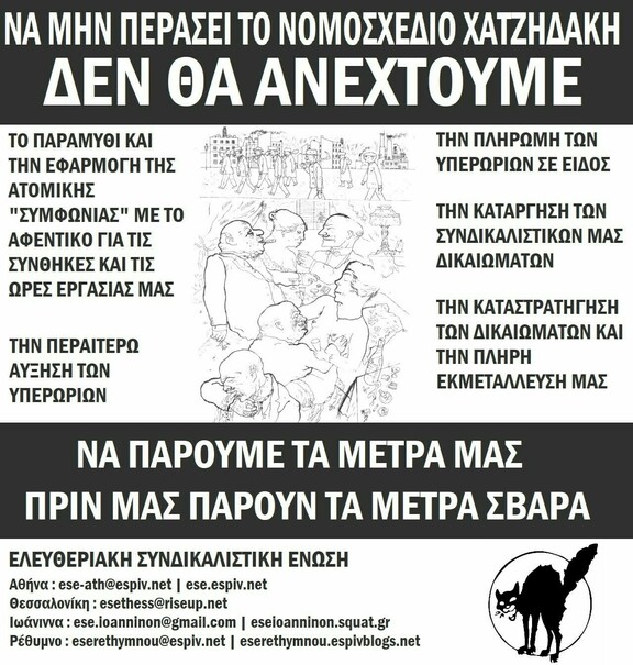 Ο Χατσηδάκης είναι ο άνθρωπος ειδικών αποστολών του ελληνικού καπιταλισμού. Αφού αποχαρακτήρισε τις δασικές εκτάσεις και αποδιοργάνωσε το σύστημα Νatura αναλάμβάνει από το νέο πόστο του Υπουργού εργασίας νέα "δολοφονικά" καθήκοντα. Τον αποχαρακτηρισμό της Εργασίας και την αποδιοργάνωση των εργασιακών σχέσεων. Απόδειξη είναι το νέο εργασιακό νομοσχέδιο που προβλέπει την κατάργηση του 8ώρου, την θεσμοθέτηση του 10ωρου, την πλήρη απελευθέρωση των απολύσεων και πλήθος αντεργατικών ρυθμίσεων. Και επειδή ο κρατικός συνδικαλισμός, αλλά και ο συνδικαλισμός σε όλες τις εκδοχές του ακολούθησε ετεροκαθοριζόμενος από το Κεφάλαιο επιταχύνοντας την κατάρρευση της μισθωτής εργασίας και ό,τι είχε κατακτηθεί μέσα από αγώνες και εξεγέρσεις.