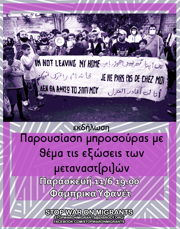 Εκδήλωση παρουσίασης της μπροσούρας με θέμα την στέγαση των μεταναστ(ρι)ών και τις εξώσεις που αντιμετωπίζουν ως αποτέλεσμα των κρατικών πολιτικών και των διάφορων νομικών ζητημάτων που προκύπτουν από αυτές ενώ παράλληλα γεννώνται και οι αντιστάσεις, οι συλλογικοποιημένοι αγώνες και η ανάγκη για συνάντηση.