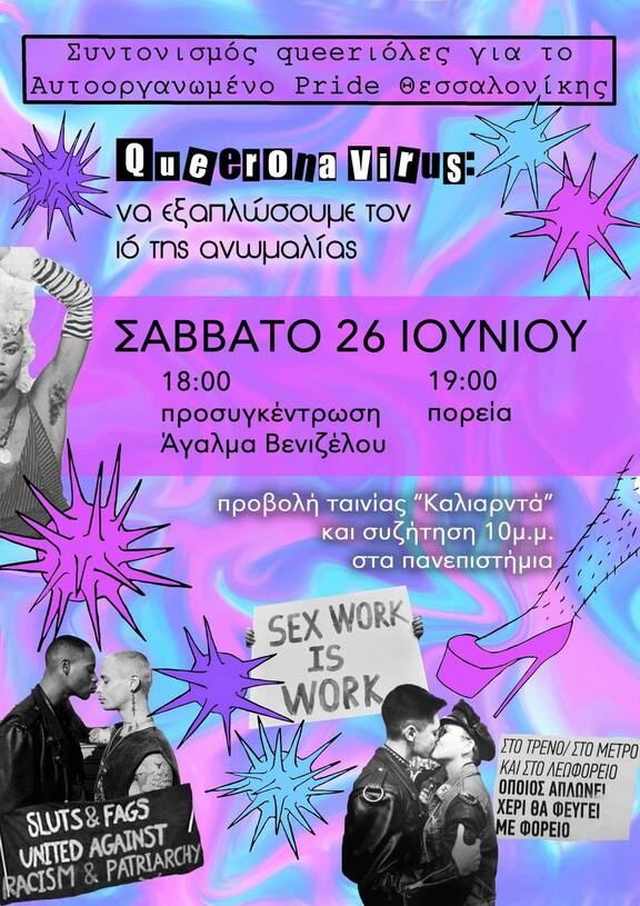 The assembly for the Self-Organized Thessaloniki Pride "Queerioles" was born through the need of queer and trans individuals to exist in a safe political space for the co-organization of the Pride, something that the pre-existing assembly for the Self-Organized Pride could not provide us with. Our goal is to reappropriate Pride from those who abuse it for money, fame or political laundering. We want Pride to remain in our hands, free from companies, parties and other authoritarian, privileged figures which oppress us on a daily basis. In our quest to build safe environments for ourselves, we are often confronted with macho, authoritarian, sexist, transphobic, and even transgressive behavior against us that create or aggravate our traumas and displace us from supposedly safe spaces. It is a fact that through growing up in a patriarchal, cishet society, where the oppressions we experience are multiple and intertwined, we carry several remnants, especially when some of us are in more privileged positions. The problem is exacerbated when we do not recognize these remnants and even reproduce them in anti-authoritarian assemblies, in LGBTQIA+/queer collective bodies, in marches, events and any other place where we try to exist freely. So our assembly was formed this year to meet our needs which even in "our" anti-institutional, anti-authoritarian or/and queer spaces are often marginalized. The Self-Organized Pride is a direct mediation of our claim and operates with horizontal procedures where authoritarian and forcible behaviors are not welcome.