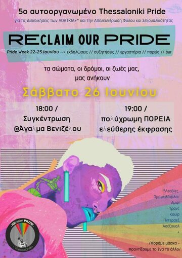 Δημοσιεύουμε κάλεσμα για το 5ο Αυτοοργανωμένο Thessaloniki PRIDE που θα πραγματοποιηθεί το Σάββατο 26/6 στο Άγαλμα Βενιζέλου στις 18:00.