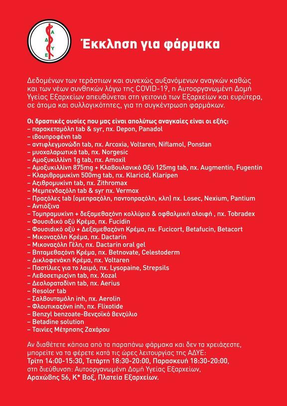 Παράλληλα, επαναλαμβάνουμε με την ευκαιρία αυτή την έκκλησή μας για φάρμακα, καθώς οι ανάγκες μας είναι πάγιες και συνεχείς. Η λίστα δραστικών ουσιών περιλαμβάνεται στα συνημμένα αρχεία.