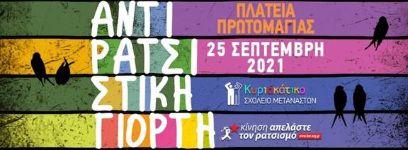 Το Σάββατο 25 Σεπτέμβρη, στην Πλατεία Πρωτομαγιάς στην Αθήνα, θα γίνει η Αντιρατσιστική Γιορτή του Κυριακάτικου Σχολείου Μεταναστών και της Κίνησης "Απελάστε το Ρατσισμό". Με συναυλίες, πάνελ συζήτησης, κινηματογράφο, εκθέσεις φωτογραφίας, σκίτσου και βιβλίου, δρώμενα, παιδότοπο και διεθνή κουζίνα. Μετά από απουσία ενός χρόνου εξ' αιτίας της πανδημίας, η Αντιρατσιστική Γιορτή επιστρέφει με anti-covid διάθεση και φιλοδοξεί να αποτελέσει ξανά ένα μεγάλο τόπο συνάντησης της συνύπαρξης, της αλληλεγγύης και της αντίστασης.