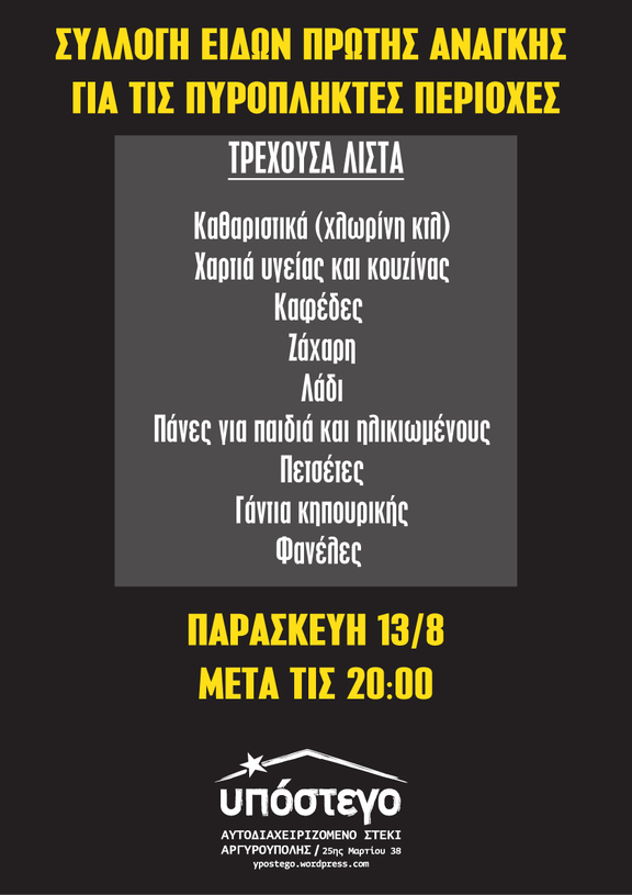 Τη Παρασκευή 13/8 (από τις 20:00 και μετά), κατά τη 2η αυγουστιάτικη μάζωξη/προβολή στο στέκι συγκεντρώνουμε και πάλι είδη 1ης ανάγκης για τους συνανθρώπους μας στις περιοχές που καίγονται ακόμα.