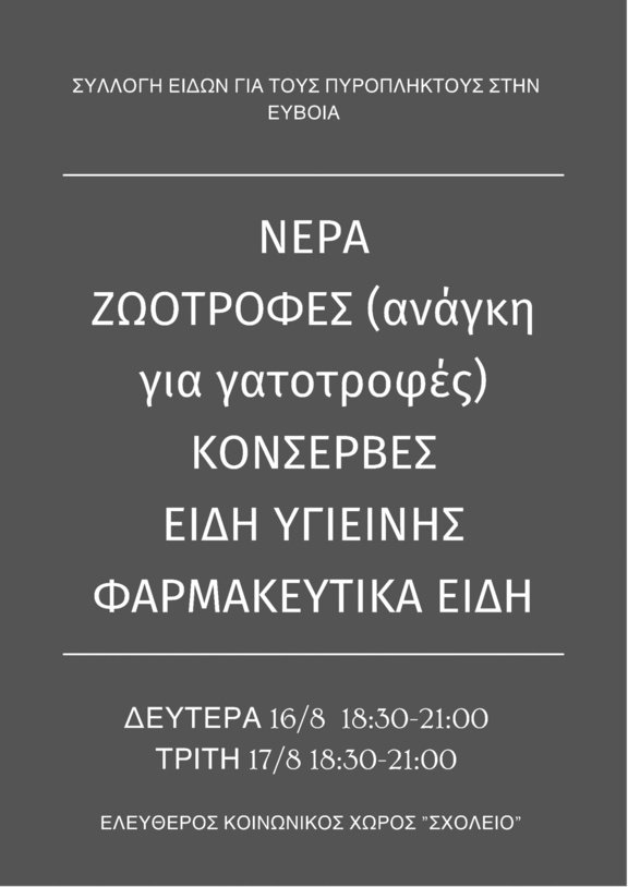 Δευτέρα 16 και Τρίτη 17 Αυγούστου 18:30-21:00 συλλέγουμε είδη για τους πυρόπληκτους στην Β.Ευβοια: