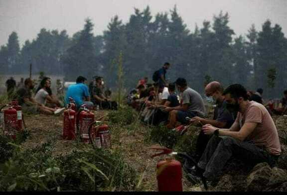 *περιγραφή εικόνας για άτομα με δυσκολίες όρασης: άνθρωποι να κάθονται στο χώμα εξοπλισμένοι με πυροσβεστηρες και μασκες και να περιμένουν την πιθανή έλευση της φωτιάς.