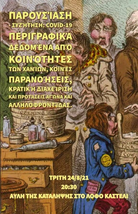 20:30 Παρουσίαση - Συζήτηση COVID-19: Περιγραφικά δεδομένα από κοινότητες των Χανίων, κοινές παρανοήσεις, κρατική διαχείριση και προτάσεις για αγώνα και αλληλοφροντίδα