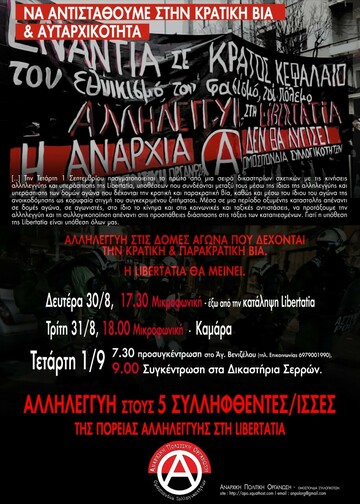 Δευτέρα 30/8 στις 17.30: μικροφωνική αλληλεγγύης έξω από την κατάληψη Libertatia