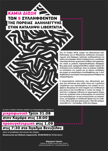 ΚΑΛΕΣΜΑ ΓΙΑ ΤΗ ΔΙΚΗ ΤΩΝ 5 ΣΥΛΛΗΦΘΕΝΤΩΝ ΤΗΣ ΠΟΡΕΙΑΣ ΑΛΛΗΛΕΓΓΥΗΣ ΣΤΗ LIBERTATIA ΣΤΙΣ 22/01/2018