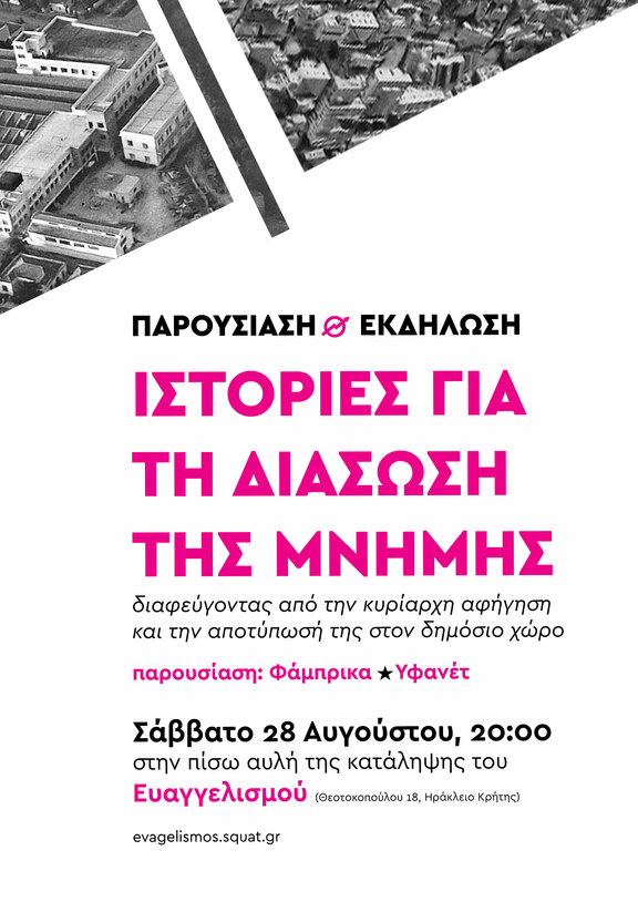 Από τις καταστροφές των οθωμανικών κτισμάτων και την εξάλειψη του εβραϊκού στοιχείου της Θεσσαλονίκης μέχρι την ανάσυρση τους για χάριν της πώλησης τους ως τουριστικό προιόν. Από την ανάδυση και την κατασκευή μνημείων εθνικής σημασίας μέχρι τον παραγκωνισμό κάποιων και τη βεβήλωση άλλων. Από το ζήτημα των αρχαίων του μετρό μέχρι τη δυνατότητα άμεσης κατεδάφισης των διατηρητέων κτιρίων. Από τις διώξεις συντρόφων και συντροφισσών μέσω της επίκλησης στον αρχαιολογικό νόμο, μέχρι και την αποκαθήλωση αγαλμάτων δυναστών από τους αγωνιζόμενους στις Η.Π.Α. Το ζήτημα της διαχείρισης της μνήμης επανέρχεται διαρκώς στην επιφάνεια, τόσο εξαιτίας της κρατικής ρύθμισής του, όσο και λόγω των διαρκών αντιστάσεων που προκύπτουν από αυτή. Σε αυτή την εκδήλωση προσπαθήσουμε να αναζητήσουμε και να συζητήσουμε για τους τρόπους έκφρασης της κυρίαρχης αφήγησης αλλά και τον τρόπο που εκφράζεται η δική μας (αντί)μνήμη.