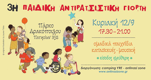 Την Κυριακή 12 Σεπτέμβρη από τις 17:30 διοργανώνουμε τη 3η Παιδική Αντιρατσιστική Γιορτή, στο Πάρκο Δρακόπουλου (Πατησίων 358).