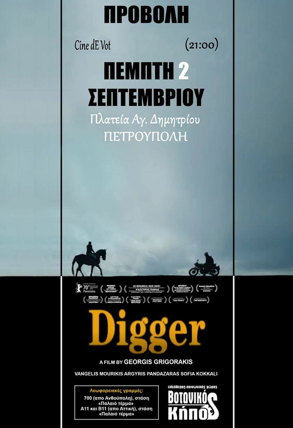 Με μια έντονη αίσθηση του τόπου αλλά και της γεωγραφίας των ανθρώπων που τον κατοικούν, η πρώτη μεγάλου μήκους του Τζώρτζη Γρηγοράκη «Digger», χτίζει μαζί το κοντινό πορτρέτο ενός πατέρα κι ενός γιου που προσπαθουν να βρουν ένα κοινό τόπο και να ξαναπιάσουν το νήμα μιας σχέσης που πριν από πολλά χρόνια κόπηκε απότομα.