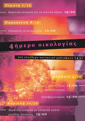 Από την Πέμπτη 7/10 μέχρι και την Κυριακή 10/10 στο ελεύθερο κοινωνικό ραδιόφωνο, θα πραγματοποιηθεί ένας κύκλος θεματικών εκπομπών πάνω σε ζητήματα οικολογίας, περιβάλλοντος και λεηλασίας της φύσης.