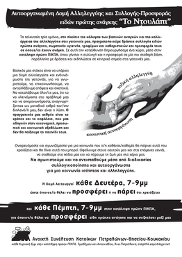 Our main goal is to gradually create a solidarity and empowerment structure in the neighborhood, to get to know each other, communicate and exchange views and thoughts. Let us all understand that getting into our problem, being isolated and recognizing our neighbor as the only enemy, is not the solution. Our real enemy is the state and the capital that lead us to financial, personal and social impoverishment and we will not play by their rules.