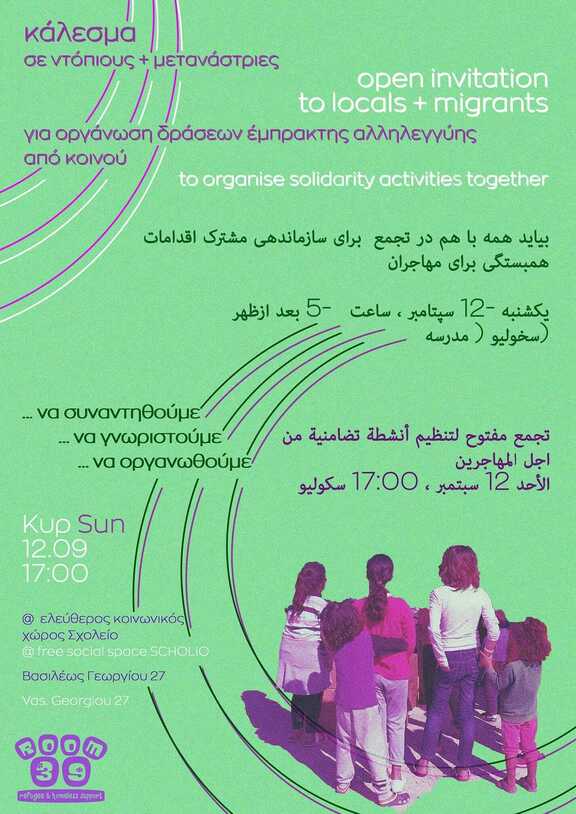Καλούμε ντόπιους και μετανάστριες σε μια συνάντηση που έχει σαν στόχο να δούμε τις ανάγκες αναφορικά με την τρέχουσα πολιτική συγκυρία, να οργανώσουμε μαζί τις αντιστάσεις, να συσπειρώσουμε ντόπιο και μεταναστευτικό πληθυσμό σε κοινούς αγώνες.