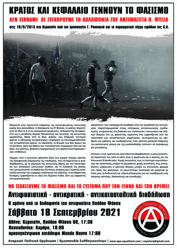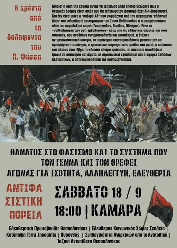 8 χρόνια μετά, η κρατική και η παρακρατική τρομοκρατία είναι εδώ να μας υπενθυμίζουν ότι ο φασισμός και το σύστημα που τον γεννά οφείλει να τσακιστεί στο δρόμο από τον κόσμο του αγώνα και της κοινωνικής βάσης. Το χρέος μας να αγωνιστούμε ενάντια στο φασισμό περνάει μέσα από τον αγώνα για την οικοδόμηση μίας κοινωνίας που δε θα υπάρχει εκμετάλλευση ανθρώπου από άνθρωπο, ενός κόσμους ισότητας, αλληλεγγύης και ελευθερίας.