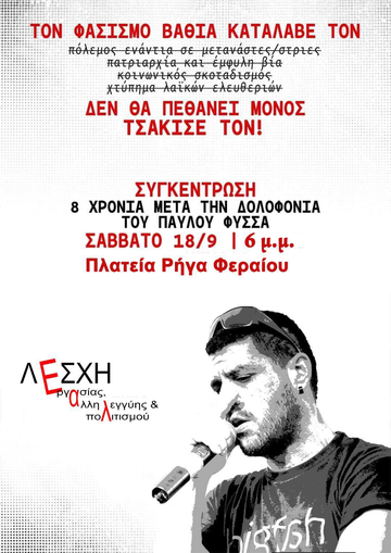 Στις 18 Σεπτεμβρίου συμπληρώνονται 8 χρόνια από την δολοφονία του Παύλου Φύσσα από τον Γ. Ρουπακιά, μέλος των ταγμάτων εφόδου της Χ.Α. Η δολοφονία αυτή αποτέλεσε το αποκορύφωμα μιας σειράς επιθέσεων σε μετανάστες/στριες και χώρους αγώνα από φασιστικές/παρακρατικές ομάδες, αρκετές από τις οποίες δεν έγιναν καν γνωστές στην ευρύτερη Ελληνική κοινωνία. Τέτοιες παρακρατικές ομάδες διαχρονικά λειτουργούν ως εφεδρεία ενός συστήματος που ωφελεί λίγους, με σκοπό την τρομοκράτηση της κοινωνίας και την καταστολή των διάφορων κοινωνικών και ταξικών αγώνων.