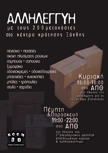 στο πλαίσιο της εκδήλωσης για το ταξίδι των Ζαπατίστας στην Ευρώπη, θα πραγματοποιείται συλλογή ειδών για τους έγκλειστους μετανάστες στο προκεκα Ξάνθης.