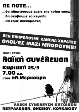 Τα νέα μέτρα οικονομικής μας αφαίμαξης δε θα μπορούσαν να μην απασχολήσουν τους ανθρώπους που βρισκόμαστε και συζητάμε στα πλαίσια της λαϊκής συνέλευσης των γειτονιών μας. Έτσι, στη συλλογική κουζίνα της Κυριακής, στήθηκε μία συζήτηση η οποία κατέληξε στην απόφαση η επόμενη λαϊκή συνέλευση στην πλατεία Μερκούρη να είναι μονοθεματική, να την απασχολήσει ο τρόπος μαζικής και συλλογικής οργάνωσης της άρνησης πληρωμής των νέων χαρατσιών.