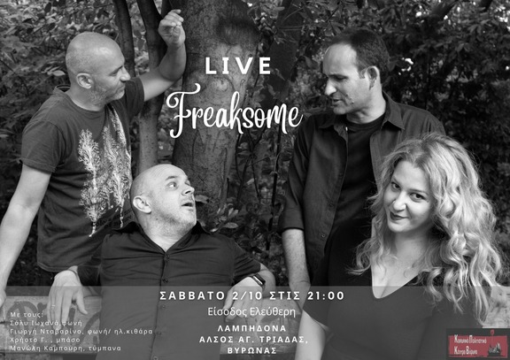 Το Σάββατο 2/10 το Κοινωνικό Πολιτιστικό Κέντρο Βύρωνα υποδέχεται στη σκηνή της Λαμπηδόνας τους Freaksome. Οι Freaksome είναι 4 μουσικοί, ταγμένοι στην εξερεύνηση του groove, μέσω των funk,soul rock επιρροών τους. Η σύνθεσή τους είναι: