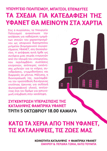 Στις 6 Αυγούστου, το Υπουργείο Πολιτισμού ανακοίνωσε την απόφαση για καθαίρεση τμημάτων στεγών του χαρακτηρισμένου ως ιστορικού διατηρητέου μνημείου βιομηχανικού συγκροτήματος ΥΦΑΝΕΤ, στη Θεσσαλονίκη. Η απόφαση αυτή ήρθε ως συνέχεια μιας σειράς ενεργειών από την πλευρά του υπουργείου, που περιλαμβάνει συστάσεις επιτροπών, απόπειρες εκπόνησης μελετών για το κτήριο, συνεδριάσεις, γνωμοδοτήσεις και διαρροές σε μήντια. Μάλιστα, η διεκπεραίωσή της, περιλαμβάνει την προϋπόθεση διενέ- ργειας επιτόπιας έρευνας για συλλογή φωτογραφικού υλικού, ανοίγοντας έτσι τον δρόμο για αστυνομική επέμβαση στην κατάληψη.