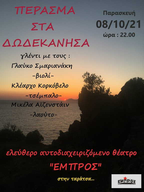 ΕΜΠΡΟΣ - Παρ. 8/10- ώρα 22.30 - Το πρώτο μας παραδοσιακό γλέντι για την φετινή σεζόν είναι γεγονός, με οργανωτές τους φίλους και τις φίλες από τα ανοιχτά μαθήματα παραδοσιακών χωρών που συνεχίζονται σταθερά κάθε Πέμπτη στις 19.00. Η Νίσυρος και όχι μόνο, έρχονται στην Αθήνα την Παρ. 8/10 για μια υπέροχη νησιώτικη βραδιά με πολύ σούστα, τραγούδι και ποτό. Κατευθείαν από την Παχιά Άμμο της Νισύρου οι καλοί μας φίλοι: Γλαύκος Σμαριανάκης βιολί, Κλέαρχος Κορκοβέλος τσέμπαλο, Μικέλα Αιζενστάιν λαούτο θα μας φέρουν την ενέργεια των Δωδεκανήσων, στην ταράτσα του Εμπρός. Σε περίπτωση βροχής η γιορτή θα γίνει στην σκηνή του θεάτρου.