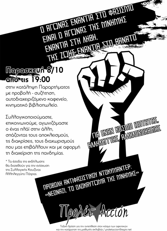 στην κατάληψη Παραρτήματος, με προβολή του αντιφασιστικού ντοκυμαντέρ