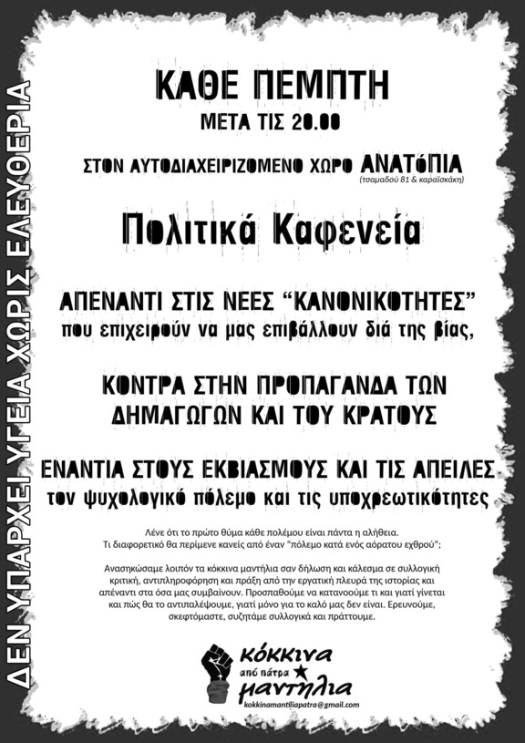 πολιτικά καφενεία κάθε πέμπτη μετά τις 20.00 στον αυτοδιαχειριζόμενο χώρο ΑΝΑΤόΠΙΑ…