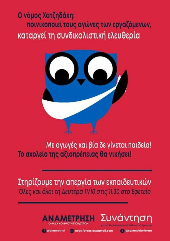 Η μάχη που δίνουν οι εκπαιδευτικοί απέναντι στον αυταρχισμό, τις απειλές και την καταστολή είναι μια μάχη που οφείλει να δώσει σύσσωμη η τάξη μας. Γι' αυτό και εμείς στεκόμαστε στο πλευρό των δασκάλων και καθηγητών, στηρίζοντας τα δίκαια αιτήματά τους και καλούμε σε συμμετοχή στην απεργιακή συγκέντρωση των εκπαιδευτικών σωματείων 11 Οκτωβρίου στις 11:30 στο Εφετείο. Με συνέπεια και σθένος, με οργάνωση στη βάση και ενότητα στη δράση, να σταθούμε εμπόδιο στα αντιλαϊκά μέτρα και την ποινικοποίηση των ταξικών αντιστάσεων.