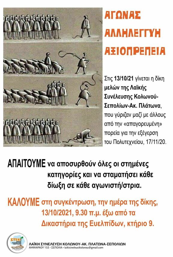 Την Τετάρτη 13/10/2021 καλούνται να δικαστούν ο φοιτητής του ΕΜΠ Ορέστης Καττής, η φοιτήτρια Νοσηλευτικής Λυδία Καττή, ο φοιτητής Πληροφορικής Νικόλας Καβακλής και ο εργαζόμενος Μάκης Λιβάνης. Για την ίδια υπόθεση έχει ξεκινήσει διωκτική διαδικασία και για τον πατέρα των 2 πρώτων νέων, Δημήτρη Καττή. Βρίσκονται κατηγορούμενοι για πλήθος αδικημάτων όπως: διατάραξη κοινής ειρήνης, απείθεια, πρόκληση απλής σωματικής βλάβης, εξύβριση, παραβίαση μέτρων covid, επικίνδυνη σωματική βλάβη, αντίσταση κατά της αρχής. Οι κατηγορίες είναι ψευδείς και κατασκευασμένες από την αστυνομία. Η αστυνομία επιτέθηκε με ιδιαίτερη βιαιότητα σε όσους αποχωρούσαν μετά το τέλος της ειρηνικής πορεία που έγινε από το σταθμό Λαρίσης προς το μετρό Σεπολίων. Ήθελε για να δικαιολογήσει τη βίαιη επίθεση και να έχει συλλήψεις, ώστε να παρουσιάσει ότι διαπράχτηκαν αδικήματα. Να εμπεδώνεται κλίμα φόβου και να επικρέμεται κίνδυνος διώξεων σε όποιον διεκδικεί, συμμετέχει, αγωνίζεται.