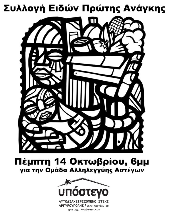 Την Πέμπτη 14 Οκτωβρίου το απόγευμα (18:00-21:00) ανοίγουμε το Υπόστεγο με αυτοδιαχειριζόμενο καφενείο και συλλογή ειδών πρώτης ανάγκης για να ενισχύσουμε την δράση της Ομάδας Αλληλεγγύης Αστέγων.