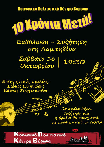 Αυτό το Σάββατο 16 Οκτωβρίου στις 7 μμ., ως Κοινωνικό Πολιτιστικό Κέντρο Βύρωνα διοργανώνουμε στην Λαμπηδόνα (άλσος Αγ. Τριάδας) εκδήλωση για τα 10 χρόνια συνεχούς λειτουργίας μας! Σας καλούμε όλους και όλες να συμμετάσχετε στην συζήτηση με θέμα "10 χρόνια μετά...". Αρχικές τοποθετήσεις θα κάνουν οι: Στέλιος Ελληνιάδης και Κώστας Στεργιόπουλος. Μετά το πέρας της συζήτησης θα ακολουθήσει μουσική βραδιά από τη Λαϊκή Ορχήστρα της Λαμπηδόνας.